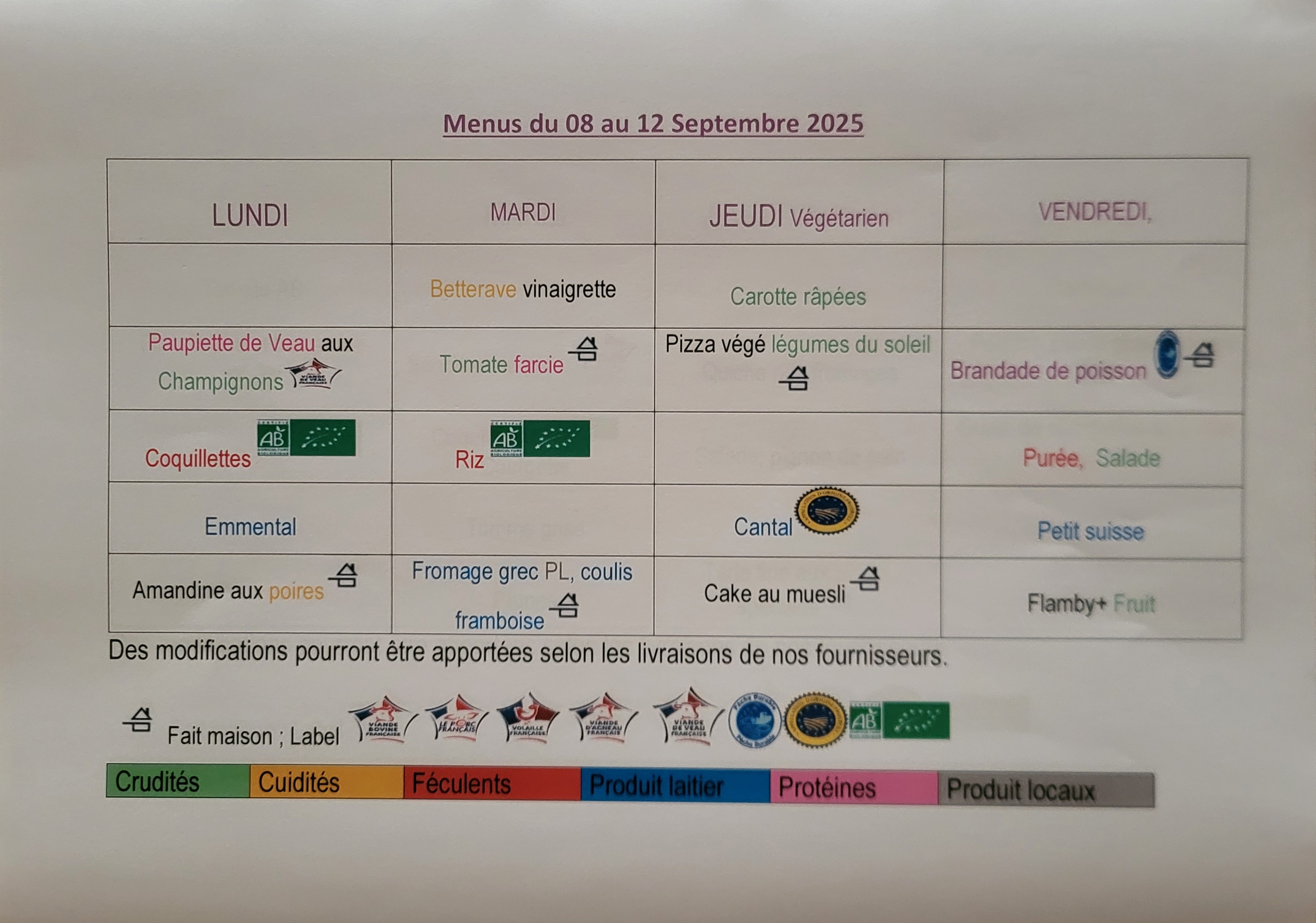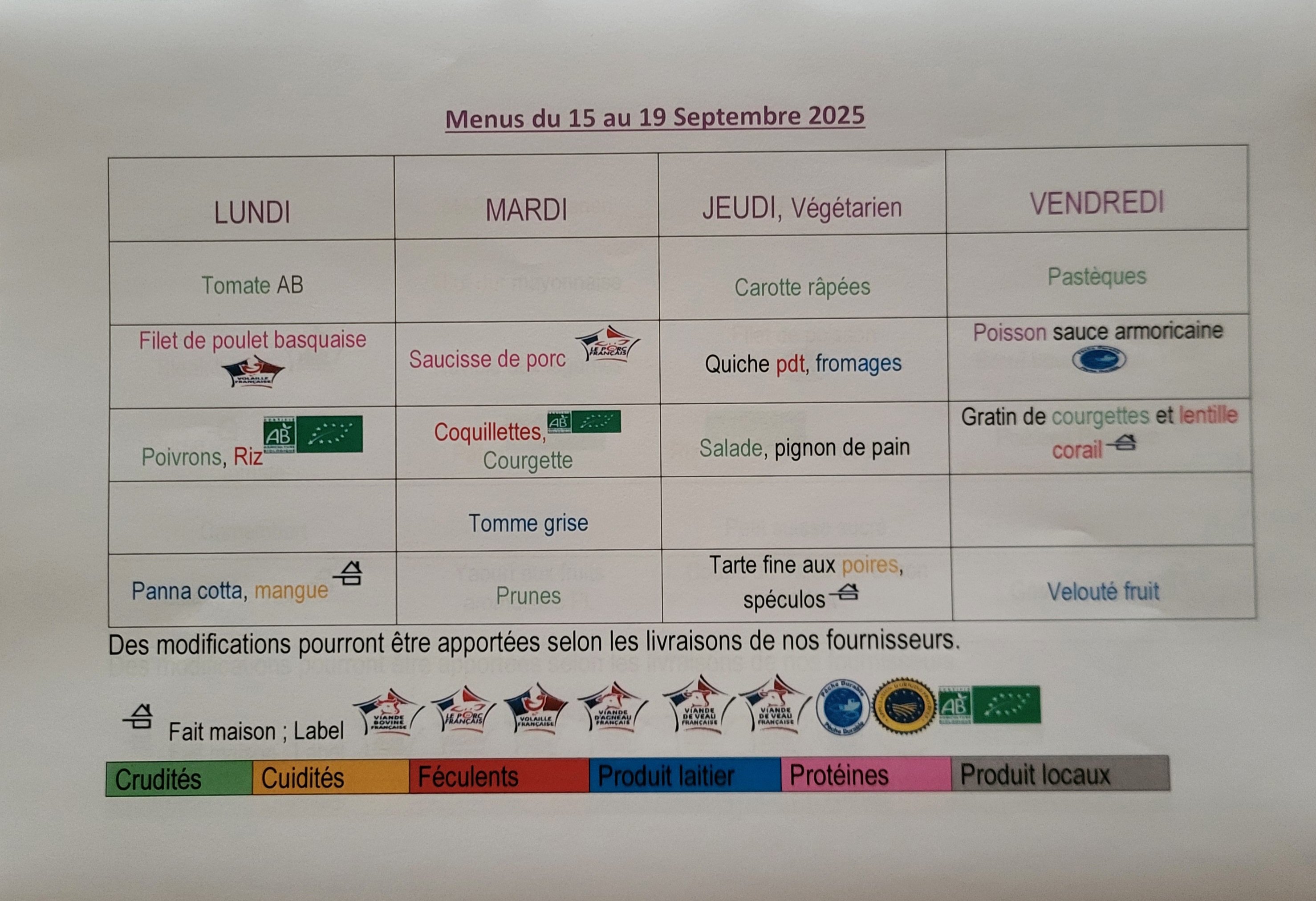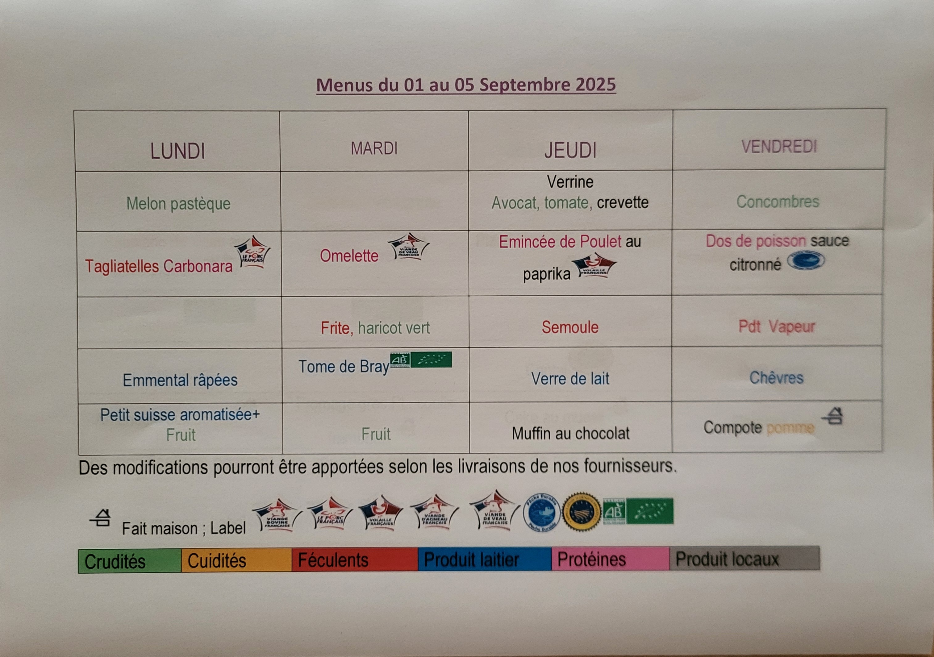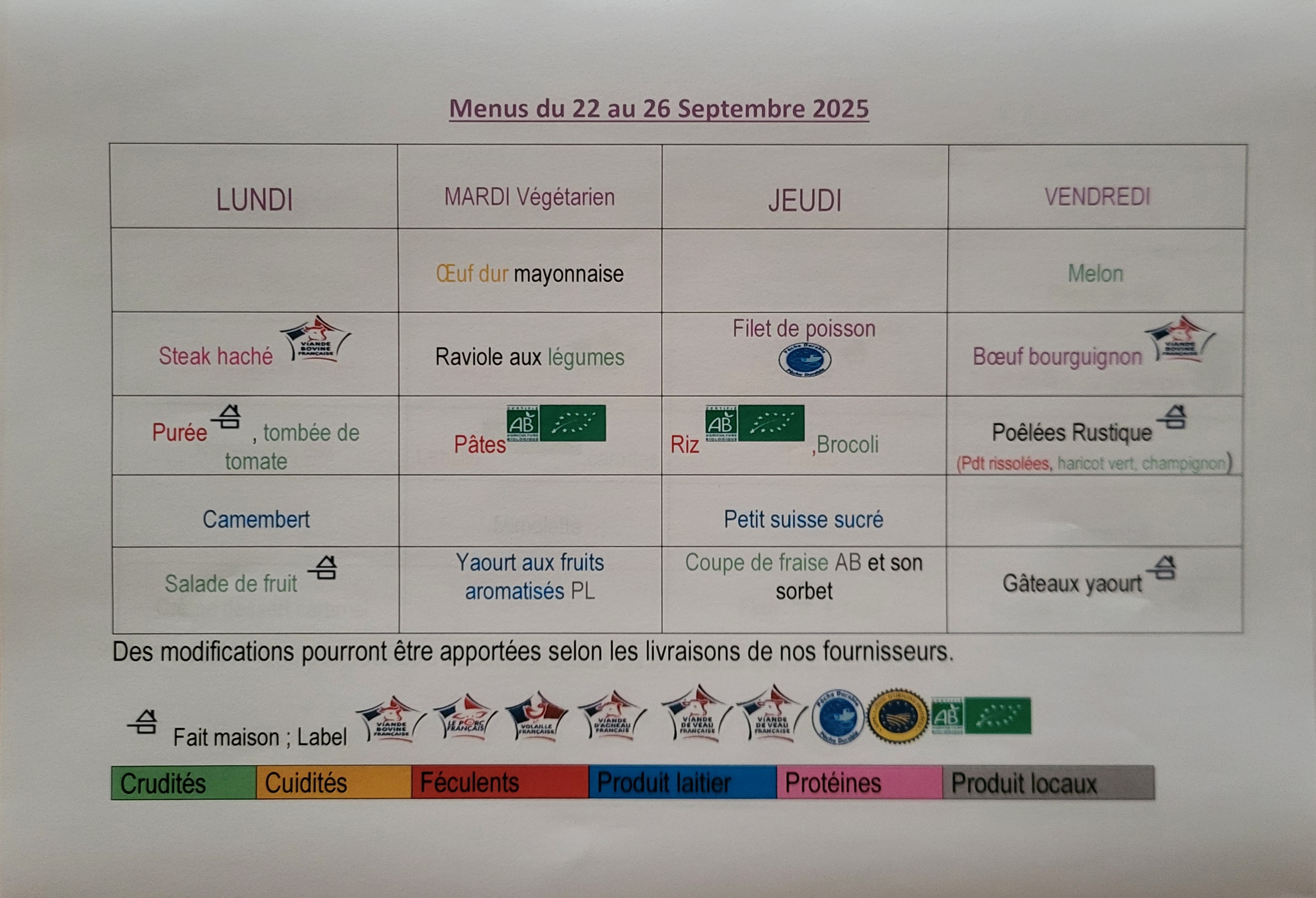 Un code couleur est appliqué sur la présentation des menus pour visualiser les 5 principales composantes : crudités, cuidités, féculents, produits laitiers et protéines.
